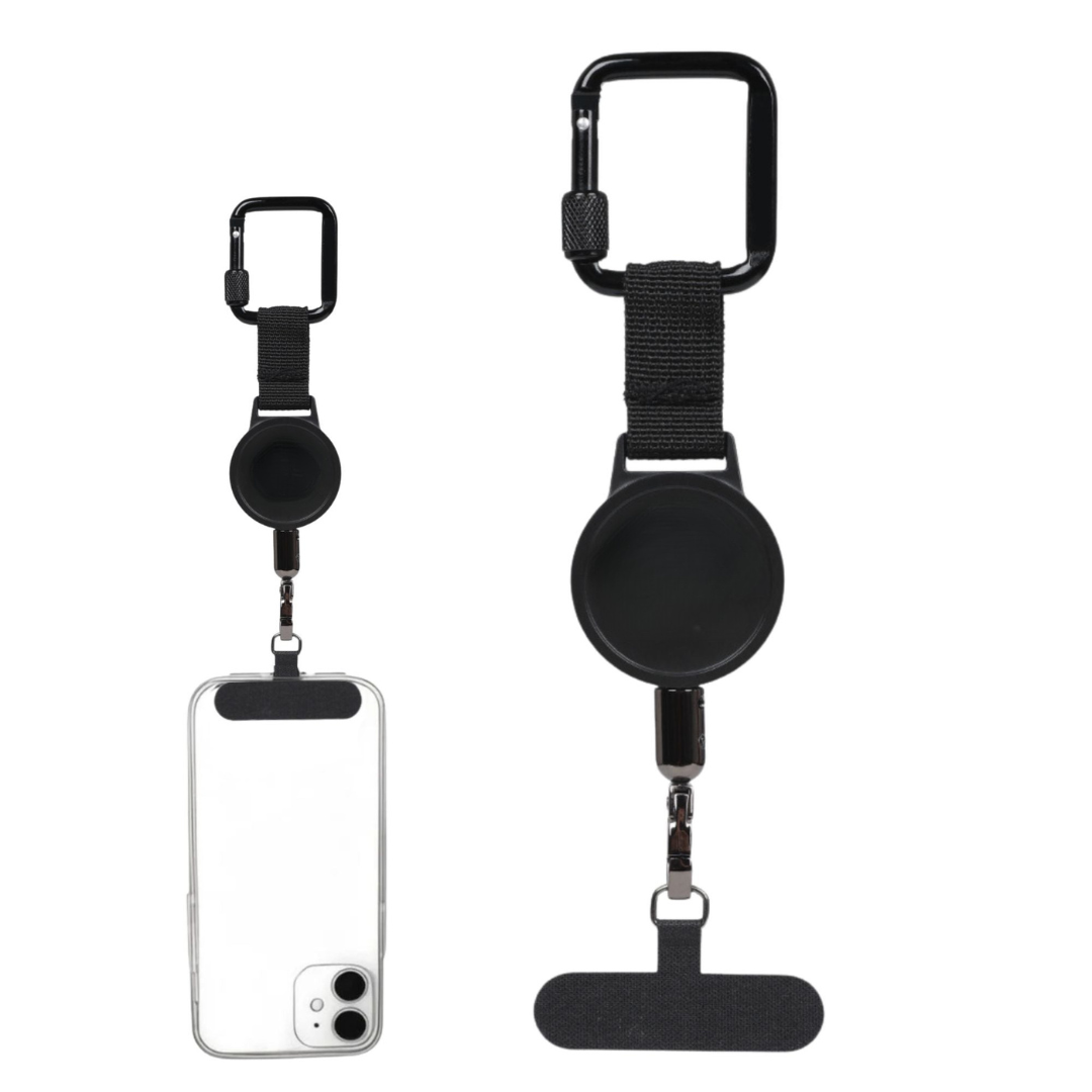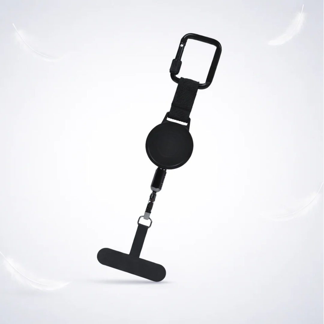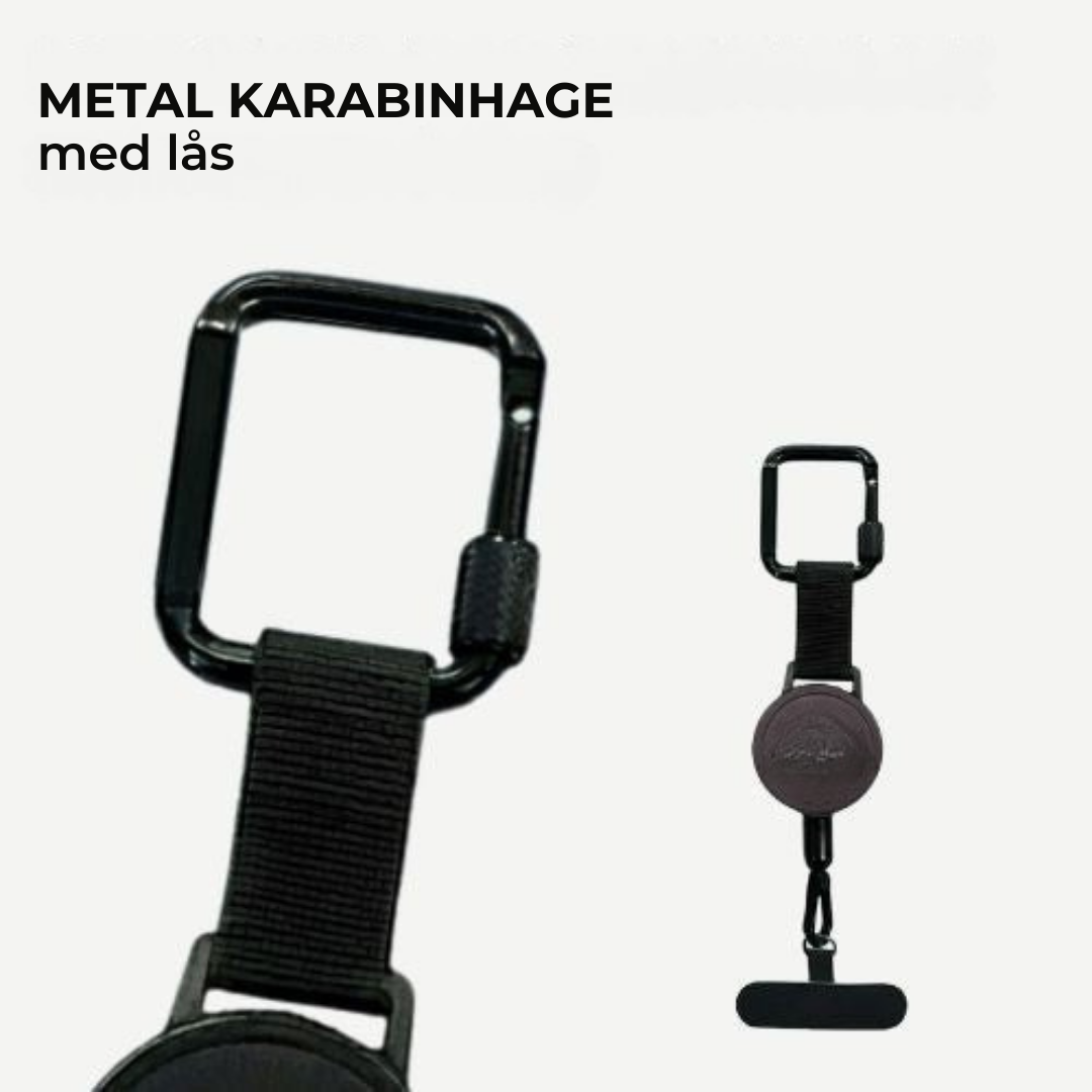 En stærk, strækbar metalwire (op til 60 cm) sikrer, at selv hvis din telefon glider, så bliver den hos dig og ikke flyver ud i skoven.