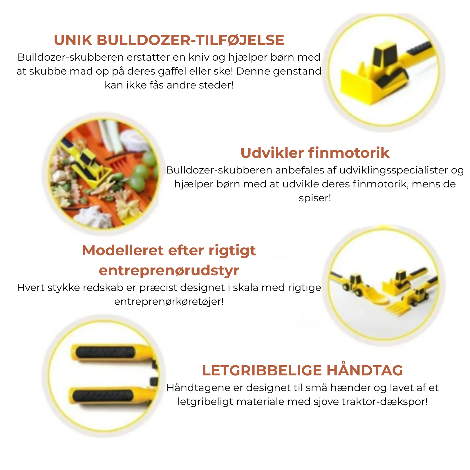 Nu, forestil dig samme scene – bare anderledes. Dit barn er fokuseret, nysgerrigt og endda begejstret. ByggeBider™ er i deres hænder, og pludselig er gulerødder ikke fjender, men last. Kartoffelmos er ikke rodet, men cement der skal spredes. Du spiser stille din egen mad, mens deres tallerken bliver tømt bid for bid.