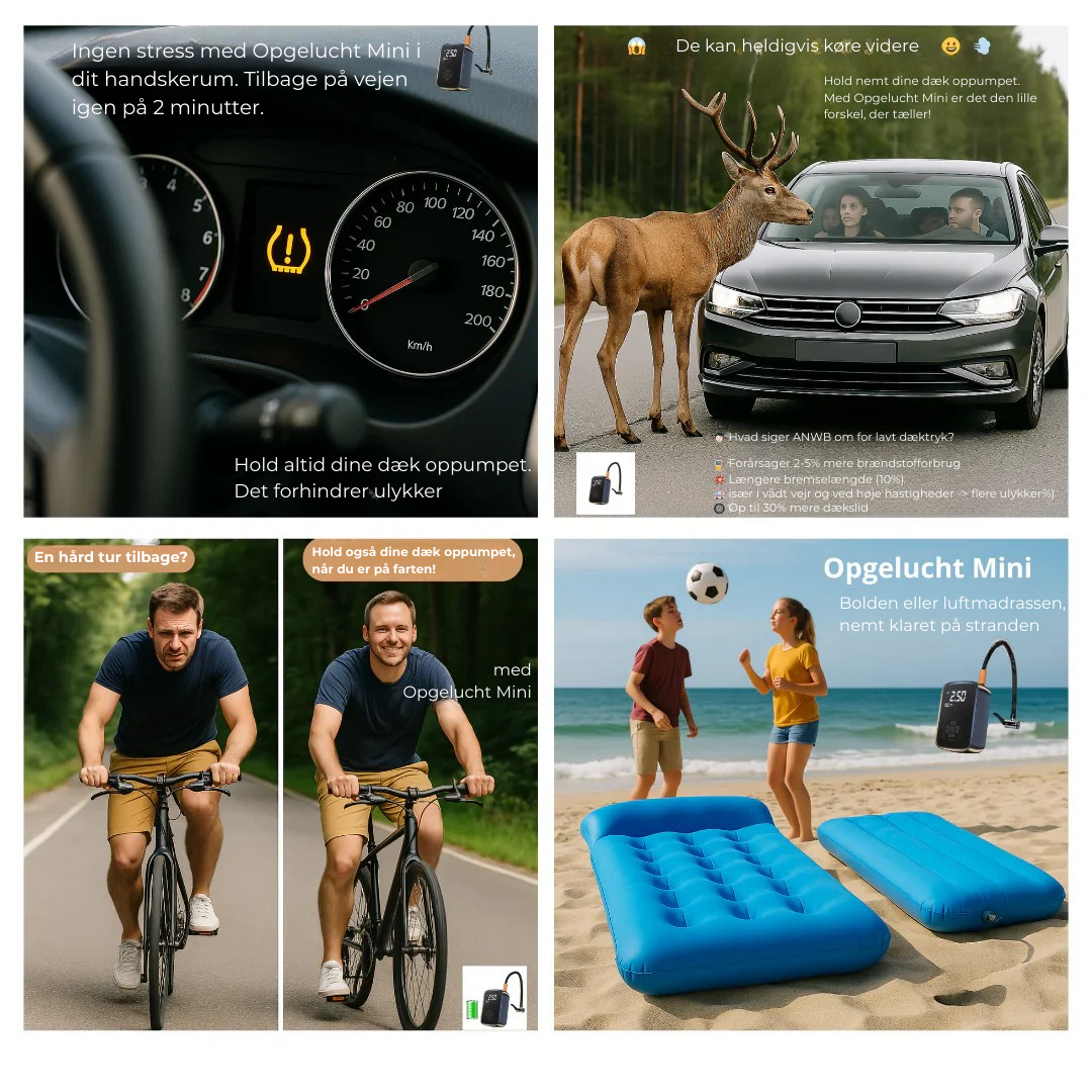 Over 25.000 tilfredse kunder i hele Europa nyder allerede friheden og sikkerheden med Opgelucht Mini. Let, kraftfuld og smart – denne lille livredder sørger for, at du aldrig står strandet med flade dæk, bolde eller madrasser igen.