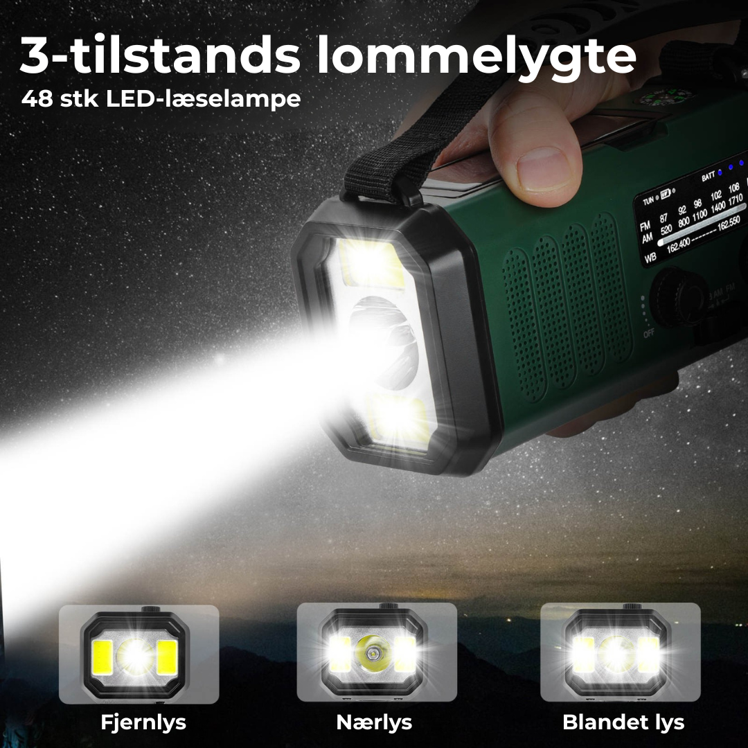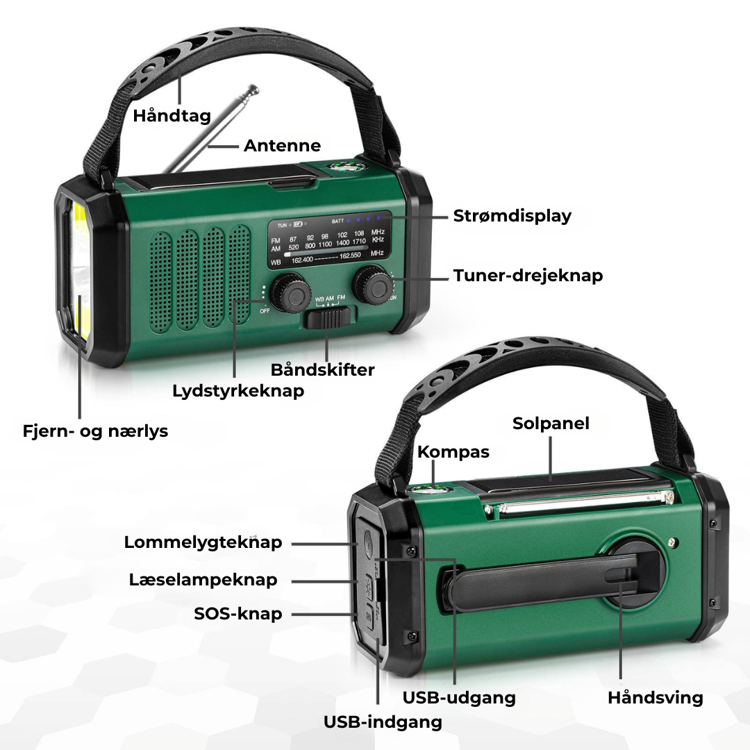 - Vær Informeret Overalt – FM/AM-radio holder dig opdateret med nødsignaler og lokale nyheder.