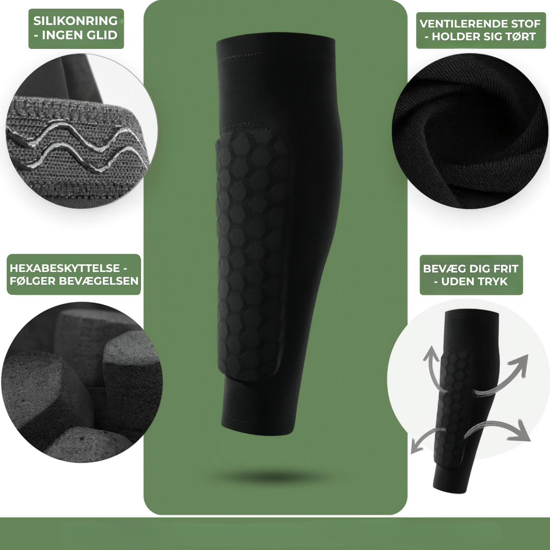 Beskyttelsen sidder direkte mod skinnebenet, under sokken, og former sig efter kroppen.